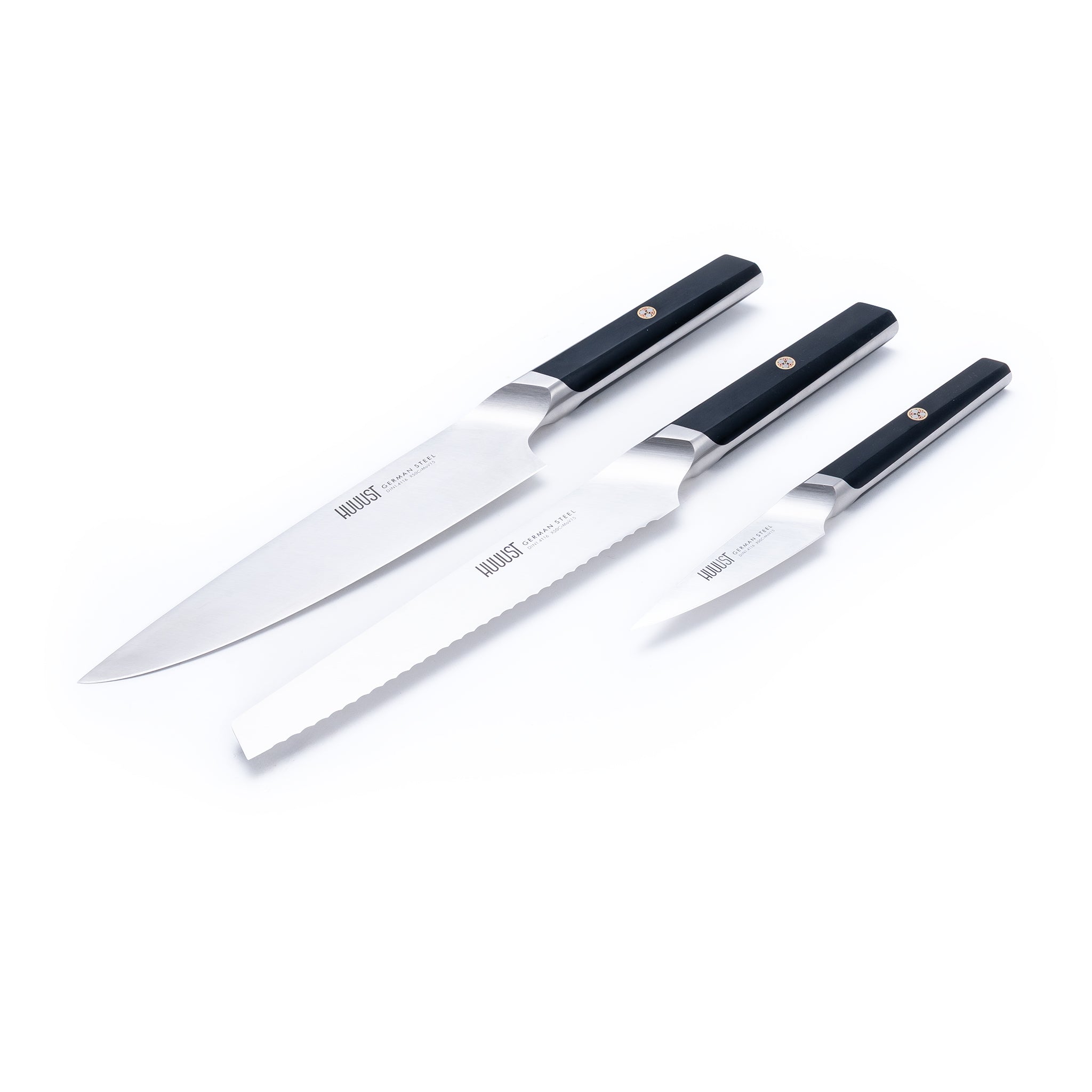 Комплектът включва готварски нож, универсален нож и нож за сладкиши с назъбено острие – идеална комбинация за рязане на месо, зеленчуци, плодове, хляб и сладкарски изделия. Всеки нож е добре балансиран и удобен за работа, което осигурява контрол и комфорт дори при по-продължително готвене.